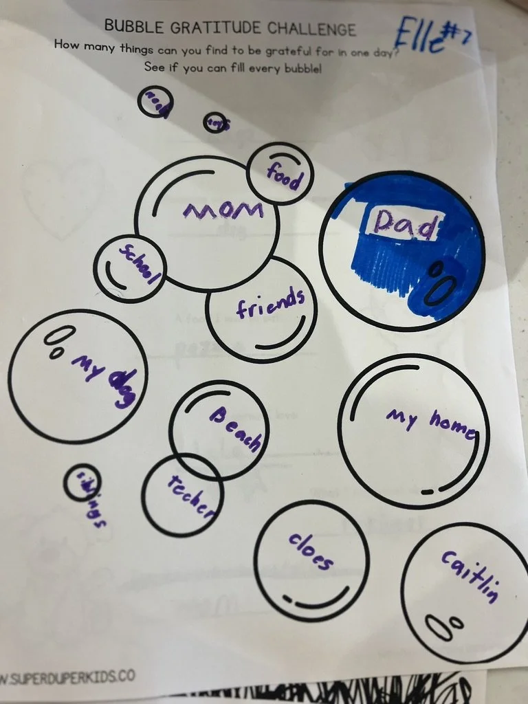 Activity sheets: I share some gratitude-themed activity sheets and crayons, so they can either color in the moment or take them home (the full pack of 12 are available on my website if parents want to download them).